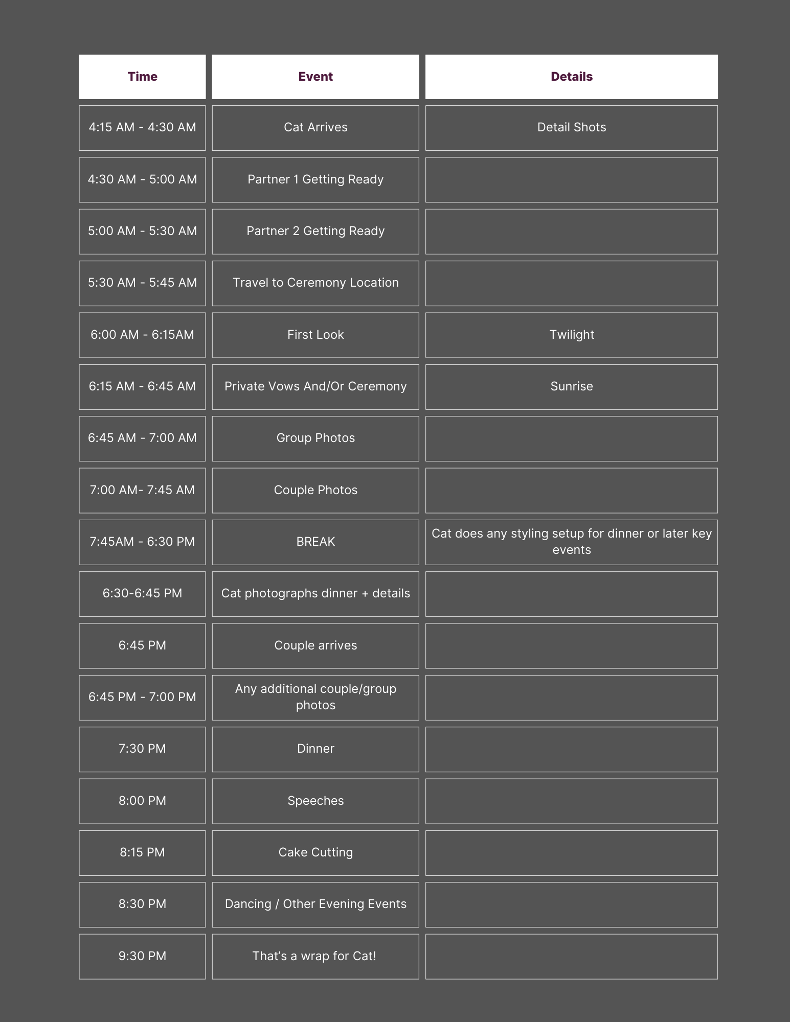 Sometimes people see 6 hours and think that’t not nearly enough time, but when things are planned well it’s plenty of time to capture all the meaningful moments without feeling rushed and still leaving time for natural interactions. Such a small group for elopements allows a lot more freedom when it comes to scheduling as well, leaving you open to sunrise or sunset depending on how you want your day to look. Below you’ll find two examples of schedules I’ve used before at real elopements, and we can always make adjustments so we create exactly what you need.