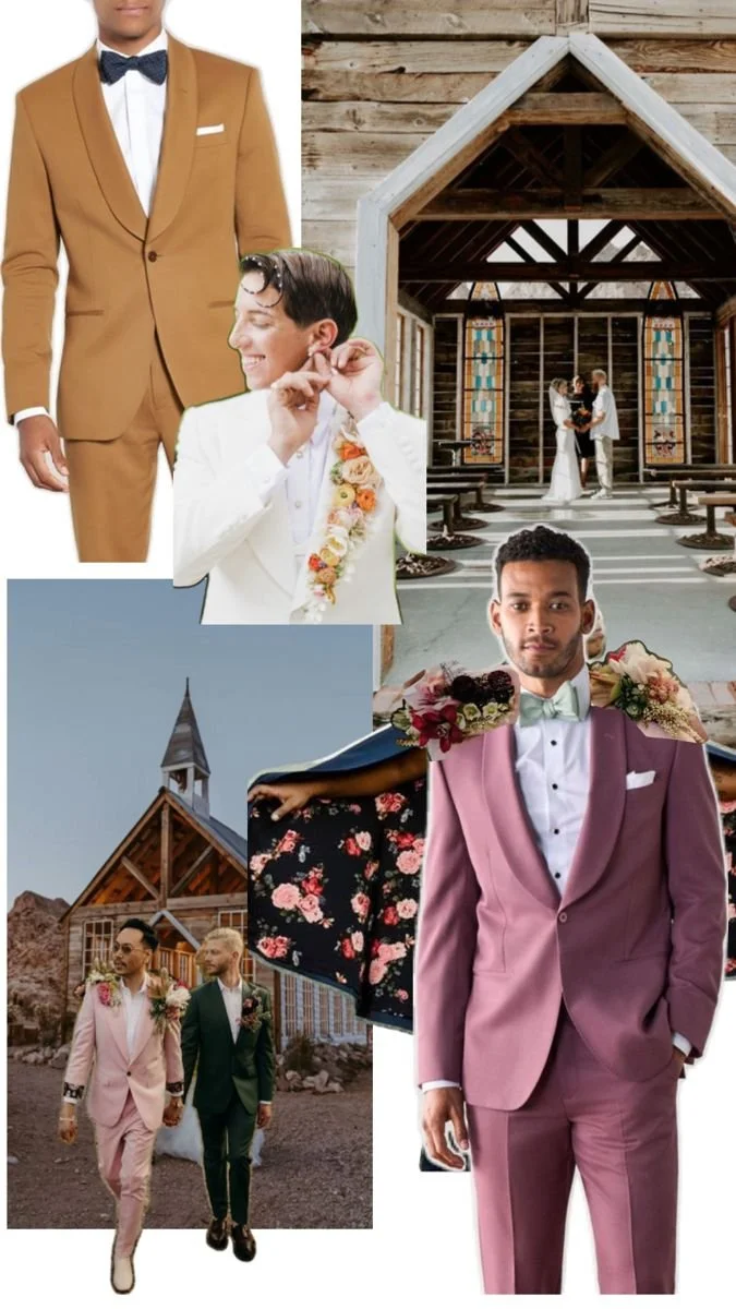 You don’t need a lot of details, but I feel these two deserved a little extra something. Using the design from the stained glass arch in the ghost town, I created an announcement design and then used a cutter to create a layered paper design. When I was out looking at materials with Elle for the cape, we both saw the pink lace from across the store and raced over. Reminiscent of The Flamingo on the strip, we knew it was the one to get. After purchasing, I had a vision and cut the lace into individual pieces that I then hand sewed onto the soft pink sheer chiffon. An absolute labor of love that I think was 100% worth it. When paired with the should cap pieces created by Morgan of Blomstra Florals, the look truly came to life. Paired with the mustard suit and floral lapel, these two bloomed like desert flowers.
